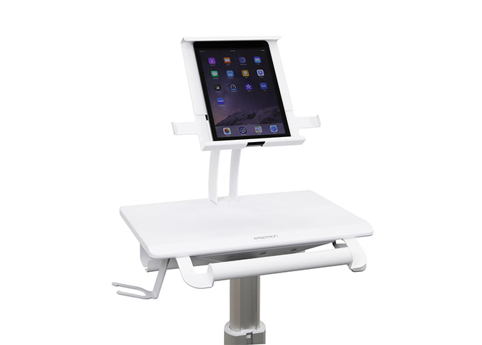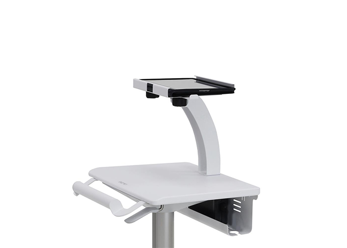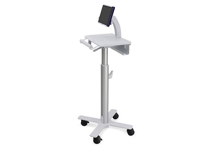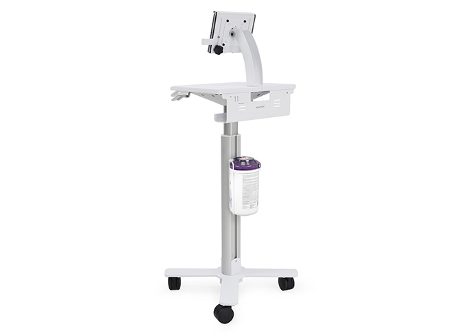 It offers 15 inches (38 cm) of effortless height adjustment, allowing users to sit or stand throughout the day, promoting a healthier work environment. It comes in three models to support various laptops, tablets, and all Microsoft Surface devices. Designed specifically for healthcare, it is lightweight, agile, and constructed from sturdy metal with a powder-coat finish for easy cleaning. The workstation features dual-wheel, 3-inch (7.6 cm) rubber casters, with two lockable casters for stability. It also includes a scanner holder and an integrated T-slot for additional accessories and power solutions.